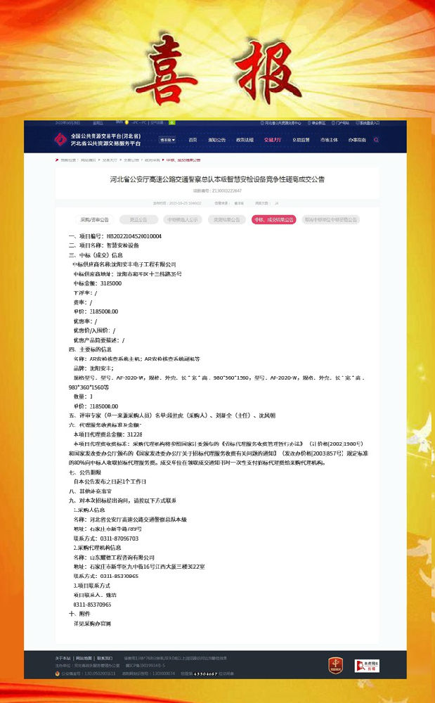 賀:河北省公安廳高速公路交通警察總隊智慧安檢設備-智慧安檢設備中標!